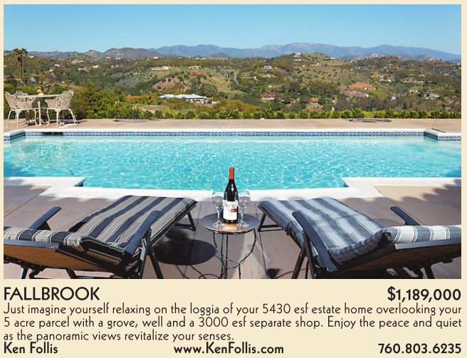FALLBROOK $1,189,000 Just imagine yourself relaxing on the loggia of your 5430 esf estate home overlooking your 5 acre parcel with a grove, well and a 3000 esf separate shop. Enjoy the peace and quiet as the panoramic views revitalize your senses. Ken Follis www.KenFollis.com 760.803.6235