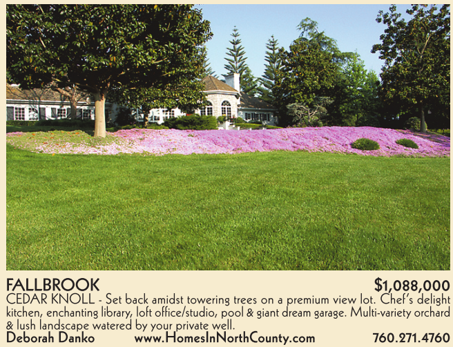 FALLBROOK $1,088,000 CEDAR KNOLL - Set back amidst towering trees on a premium view lot. Chef’s delight kitchen, enchanting library, loft office/studio, pool & giant dream garage. Multi-variety orchard & lush landscape watered by your private well. Deborah Danko www.HomesInNorthCounty.com 760.271.4760