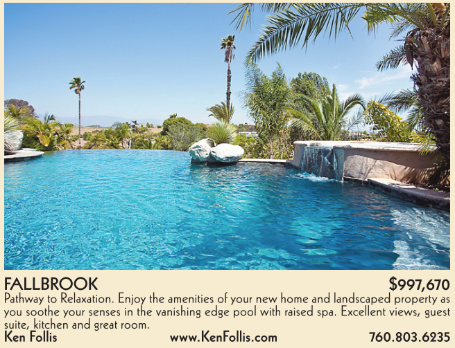 FALLBROOK $997,670 Pathway to Relaxation. Enjoy the amenities of your new home and landscaped property as you soothe your senses in the vanishing edge pool with raised spa. Excellent views, guest suite, kitchen and great room. Ken Follis www.KenFollis.com 760.803.6235