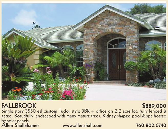 FALLBROOK $889,000 Single story 3550 esf custom Tudor style 3BR + office on 2.2 acre lot, fully fenced & gated. Beautifully landscaped with many mature trees. Kidney shaped pool & spa heated by solar panels. Allen Shallahamer www.allenshall.com 760.802.6740