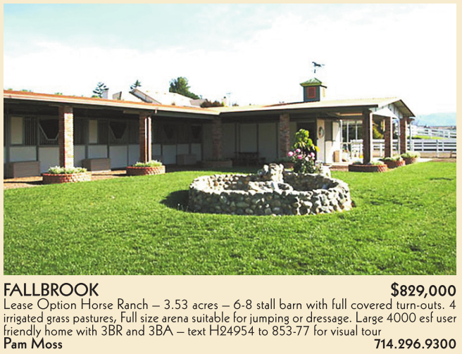 FALLBROOK $829,000 Lease Option Horse Ranch – 3.53 acres – 6-8 stall barn with full covered turn-outs. 4 irrigated grass pastures, Full size arena suitable for jumping or dressage. Large 4000 esf user friendly home with 3BR and 3BA – text H24954 to 853-77 for visual tour Pam Moss 714.296.9300