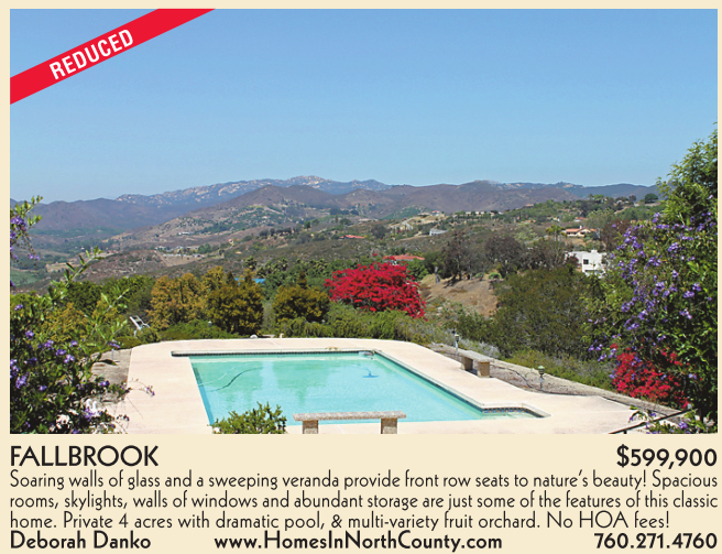 FALLBROOK $599,900 Soaring walls of glass and a sweeping veranda provide front row seats to nature’s beauty! Spacious rooms, skylights, walls of windows and abundant storage are just some of the features of this classic home. Private 4 acres with dramatic pool, & multi-variety fruit orchard. No HOA fees! Deborah Danko www.HomesInNorthCounty.com 760.271.4760