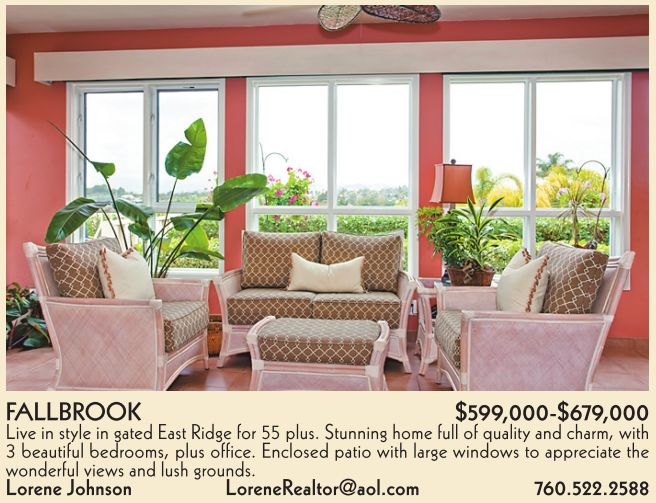 FALLBROOK $599,000-$679,000 Live in style in gated East Ridge for 55 plus. Stunning home full of quality and charm, with 3 beautiful bedrooms, plus office. Enclosed patio with large windows to appreciate the wonderful views and lush grounds. Lorene Johnson LoreneRealtor@aol.com 760.522.2588
