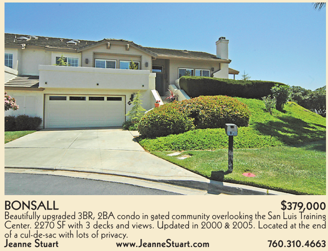 BONSALL $379,000 Beautifully upgraded 3BR, 2BA condo in gated community overlooking the San Luis Training Center. 2270 SF with 3 decks and views. Updated in 2000 & 2005. Located at the end of a cul-de-sac with lots of privacy. Jeanne Stuart www.JeanneStuart.com 760.310.4663