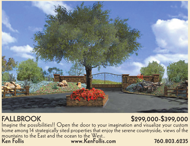 FALLBROOK $299,000-$399,000 Imagine the possibilities!! Open the door to your imagination and visualize your custom home among 14 strategically sited properties that enjoy the serene countryside, views of the mountains to the East and the ocean to the West.. Ken Follis www.KenFollis.com 760.803.6235