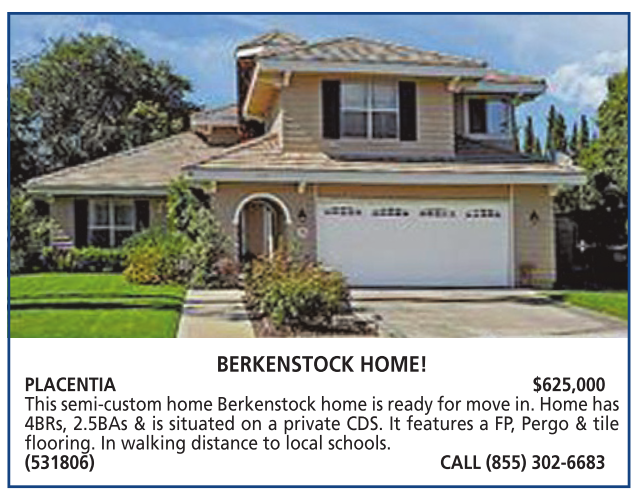 BERKENSTOCK HOME! PLACENTIA $625,000 This semi-custom home Berkenstock home is ready for move in. Home has 4BRs, 2.5BAs & is situated on a private CDS. It features a FP, Pergo & tile flooring. In walking distance to local schools. (531806) CALL (855) 302-6683