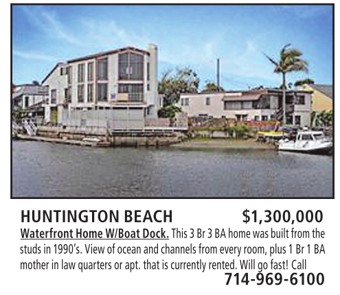 HUNTINGTON BEACH $1,300,000 Waterfront Home W/Boat Dock. This 3 Br 3 BA home was built from the studs in 1990’s. View of ocean and channels from every room, plus 1 Br 1 BA mother in law quarters or apt. that is currently rented. Will go fast! Call 714-969-6100