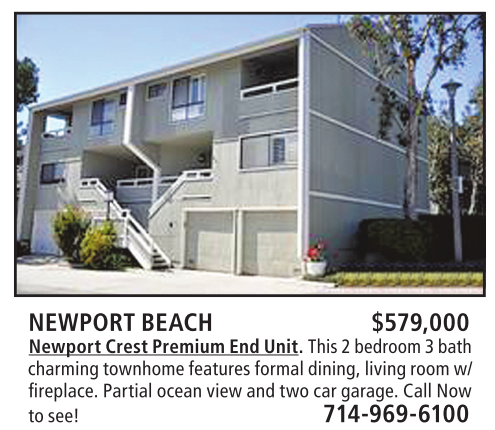 NEWPORT BEACH $579,000 Newport Crest Premium End Unit. This 2 bedroom 3 bath charming townhome features formal dining, living room w/ fireplace. Partial ocean view and two car garage. Call Now to see! 714-969-6100