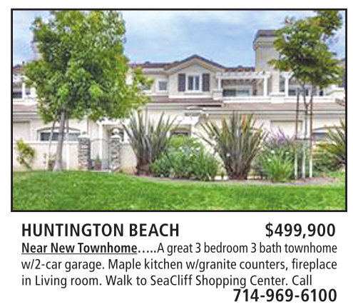 HUNTINGTON BEACH $499,900 Near New Townhome…..A great 3 bedroom 3 bath townhome w/2-car garage. Maple kitchen w/granite counters, fireplace in Living room. Walk to SeaCliff Shopping Center. Call 714-969-6100