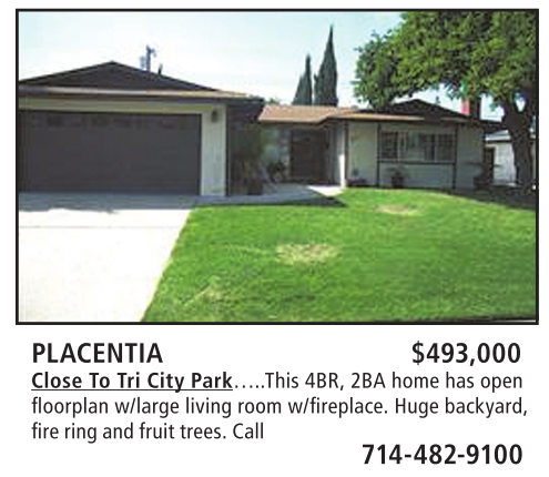PLACENTIA $493,000 Close To Tri City Park…..This 4BR, 2BA home has open fl oorplan w/large living room w/fi replace. Huge backyard, fire ring and fruit trees. Call 714-482-9100