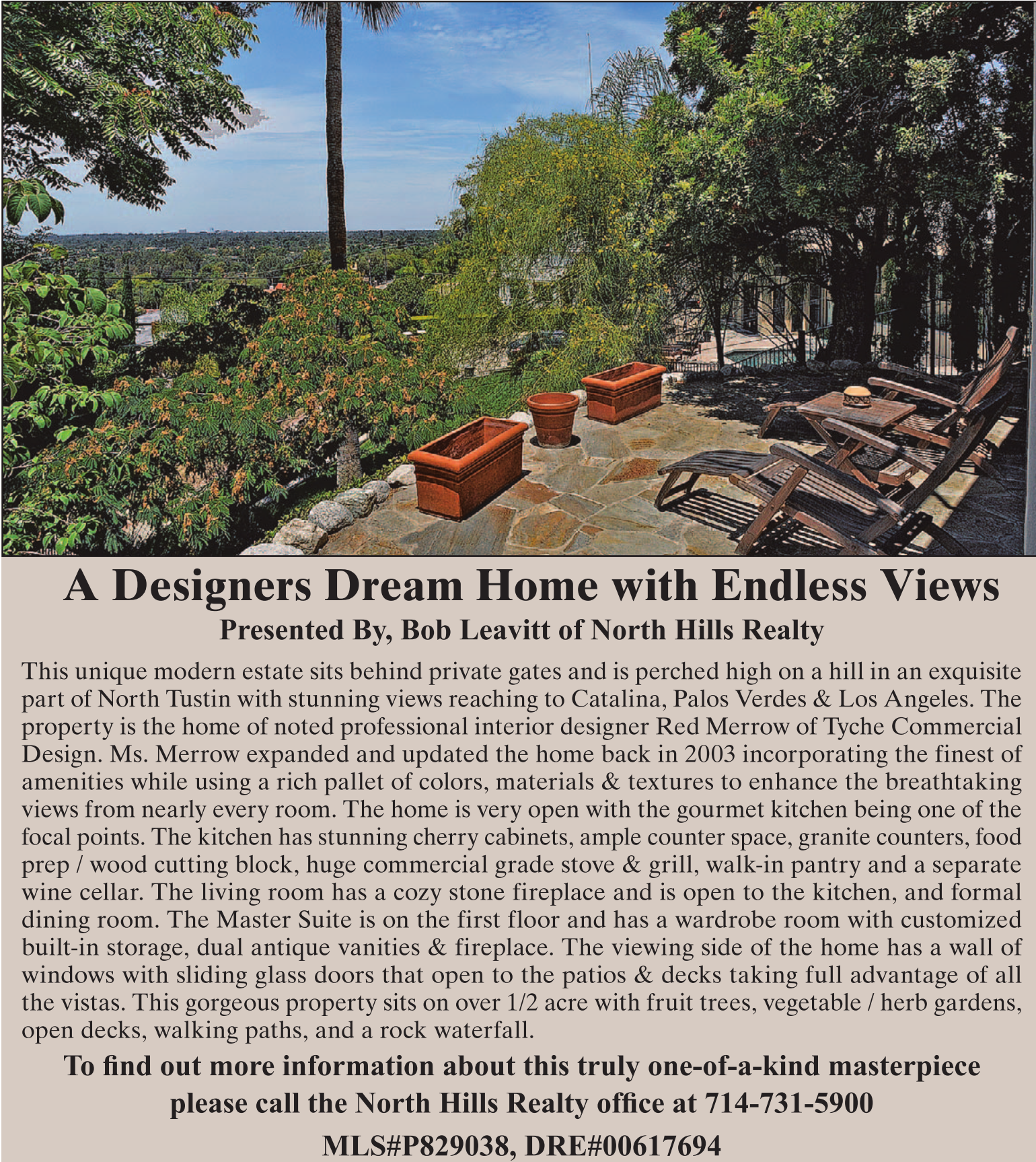 A Designers Dream Home with Endless Views Presented By, Bob Leavitt of North Hills Realty This unique modern estate sits behind private gates and is perched high on a hill in an exquisite part of North Tustin with stunning views reaching to Catalina, Palos Verdes & Los Angeles. The property is the home of noted professional interior designer Red Merrow of Tyche Commercial Design. Ms. Merrow expanded and updated the home back in 2003 incorporating the finest of amenities while using a rich pallet of colors, materials & textures to enhance the breathtaking views from nearly every room. The home is very open with the gourmet kitchen being one of the focal points. The kitchen has stunning cherry cabinets, ample counter space, granite counters, food prep / wood cutting block, huge commercial grade stove & grill, walk-in pantry and a separate wine cellar. The living room has a cozy stone fireplace and is open to the kitchen, and formal dining room. The Master Suite is on the first floor and has a wardrobe room with customized built-in storage, dual antique vanities & fireplace. The viewing side of the home has a wall of windows with sliding glass doors that open to the patios & decks taking full advantage of all the vistas. This gorgeous property sits on over 1/2 acre with fruit trees, vegetable / herb gardens, open decks, walking paths, and a rock waterfall. To find out more information about this truly one-of-a-kind masterpiece please call the North Hills Realty office at 714-731-5900 MLS#P829038, DRE#00617694