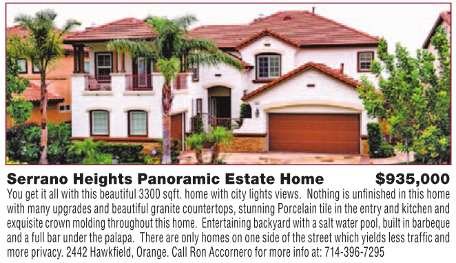 Serrano Heights Panoramic Estate Home $935,000 You get it all with this beautiful 3300 sqft. home with city lights views. Nothing is unfi nished in this home with many upgrades and beautiful granite countertops, stunning Porcelain tile in the entry and kitchen and exquisite crown molding throughout this home. Entertaining backyard with a salt water pool, built in barbeque and a full bar under the palapa. There are only homes on one side of the street which yields less traffi c and more privacy. 2442 Hawkfi eld, Orange. Call Ron Accornero for more info at: 714-396-7295