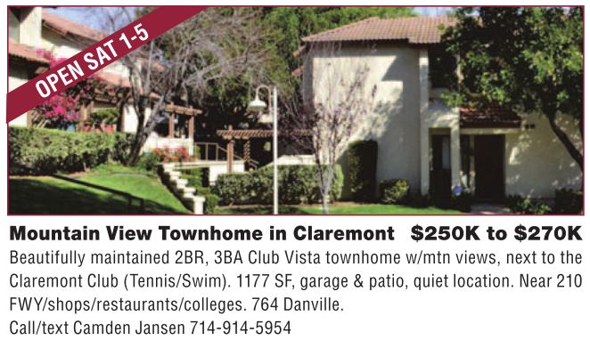 Mountain View Townhome in Claremont $250K to $270K Beautifully maintained 2BR, 3BA Club Vista townhome w/mtn views, next to the Claremont Club (Tennis/Swim). 1177 SF, garage & patio, quiet location. Near 210 FWY/shops/restaurants/colleges. 764 Danville. Call/text Camden Jansen 714-914-5954