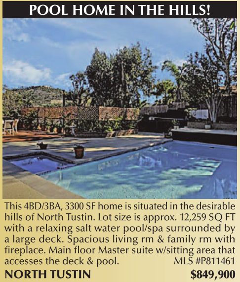 This 4BD/3BA, 3300 SF home is situated in the desirable hills of North Tustin. Lot size is approx. 12,259 SQ FT with a relaxing salt water pool/spa surrounded by a large deck. Spacious living rm & family rm with fireplace. Main floor Master suite w/sitting area that accesses the deck & pool. MLS #P811461 NORTH TUSTIN $849,900