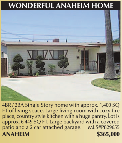 4BR / 2BA Single Story home with approx. 1,400 SQ FT of living space. Large living room with cozy fire place, country style kitchen with a huge pantry. Lot is approx. 6,449 SQ FT. Large backyard with a covered patio and a 2 car attached garage. MLS#P829655 ANAHEIM $365,000