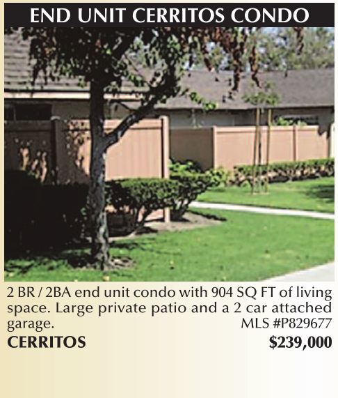 2 BR / 2BA end unit condo with 904 SQ FT of living space. Large private patio and a 2 car attached garage. MLS #P829677 CERRITOS $239,000