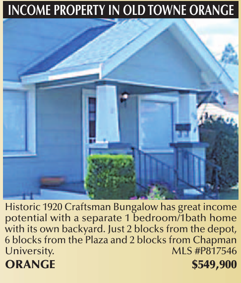 Historic 1920 Craftsman Bungalow has great income potential with a separate 1 bedroom/1bath home with its own backyard. Just 2 blocks from the depot, 6 blocks from the Plaza and 2 blocks from Chapman University. MLS #P817546 ORANGE $549,900
