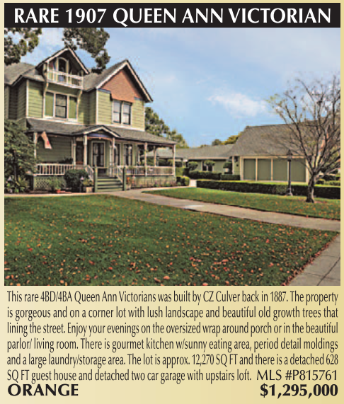 This rare 4BD/4BA Queen Ann Victorians was built by CZ Culver back in 1887. The property is gorgeous and on a corner lot with lush landscape and beautiful old growth trees that lining the street. Enjoy your evenings on the oversized wrap around porch or in the beautiful parlor/ living room. There is gourmet kitchen w/sunny eating area, period detail moldings and a large laundry/storage area. The lot is approx. 12,270 SQ FT and there is a detached 628 SQ FT guest house and detached two car garage with upstairs loft. MLS #P815761 ORANGE $1,295,000