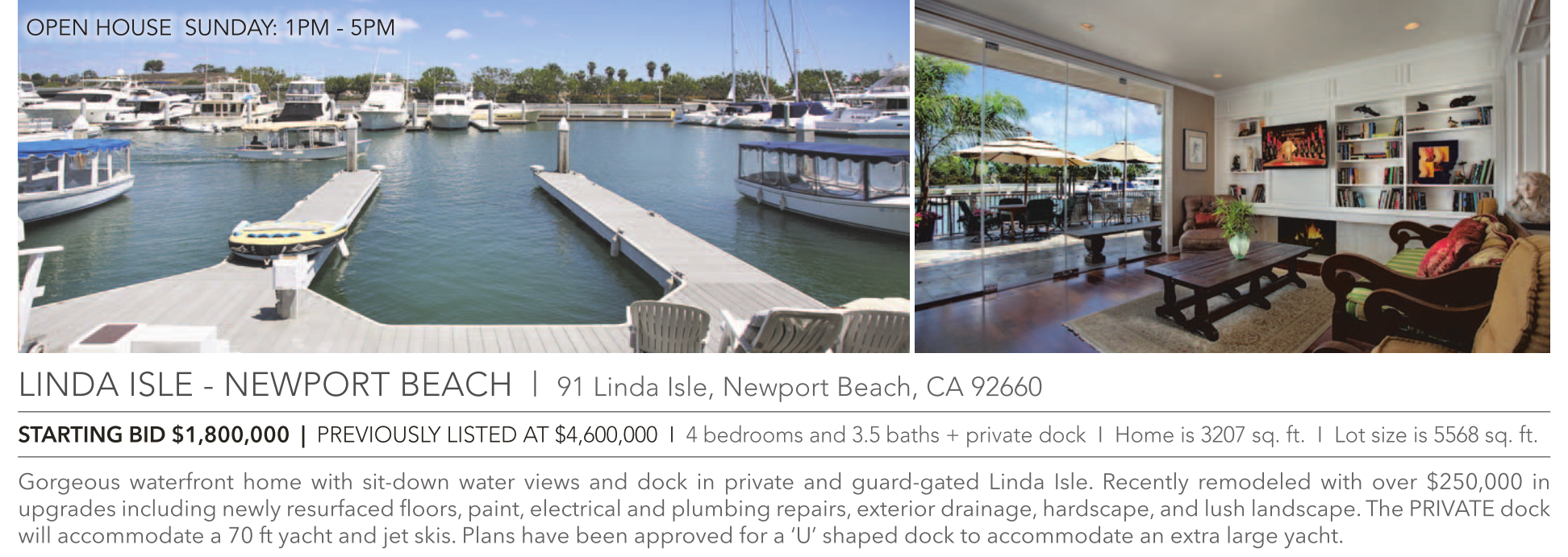 OPEN HOUSE SUNDAY: 1PM - 5PM LINDA ISLE - NEWPORT BEACH | 91 Linda Isle, Newport Beach, CA 92660 STARTING BID $1,800,000 | PREVIOUSLY LISTED AT $4,600,000 I 4 bedrooms and 3.5 baths + private dock I Home is 3207 sq. ft. I Lot size is 5568 sq. ft. Gorgeous waterfront home with sit-down water views and dock in private and guard-gated Linda Isle. Recently remodeled with over $250,000 in upgrades including newly resurfaced floors, paint, electrical and plumbing repairs, exterior drainage, hardscape, and lush landscape. The PRIVATE dock will accommodate a 70 ft yacht and jet skis. Plans have been approved for a ‘U’ shaped dock to accommodate an extra large yacht.
