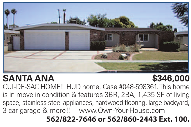 SANTA ANA $346,000 CUL-DE-SAC HOME! HUD home, Case #048-598361. This home is in move in condition & features 3BR, 2BA, 1,435 SF of living space, stainless steel appliances, hardwood flooring, large backyard, 3 car garage & more!! www.Own-Your-House.com 562/822-7646 or 562/860-2443 Ext. 100.