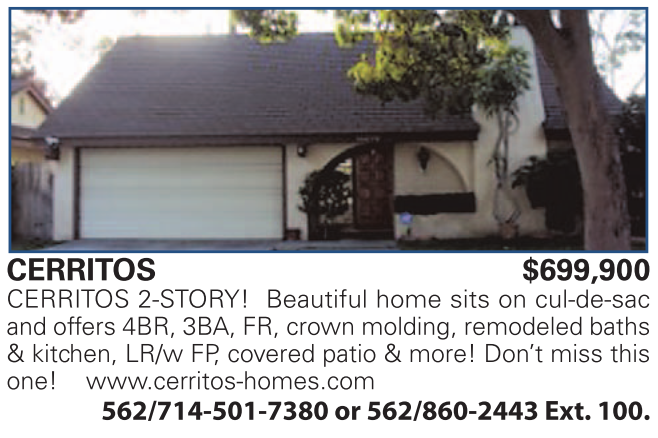 CERRITOS $699,900 CERRITOS 2-STORY! Beautiful home sits on cul-de-sac and offers 4BR, 3BA, FR, crown molding, remodeled baths & kitchen, LR/w FP, covered patio & more! Don’t miss this one! www.cerritos-homes.com 562/714-501-7380 or 562/860-2443 Ext. 100.