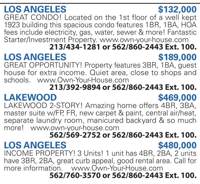 LOS ANGELES $132,000 GREAT CONDO! Located on the 1st floor of a well kept 1923 building this spacious condo features 1BR, 1BA, HOA fees include electricity, gas, water, sewer & more! Fantastic Starter/Investment Property. www.own-your-house.com 213/434-1281 or 562/860-2443 Ext. 100. LOS ANGELES $189,000 GREAT OPPORTUNITY! Property features 3BR, 1BA, guest house for extra income. Quiet area, close to shops and schools. www.Own-Your-House.com 213/392-9894 or 562/860-2443 Ext. 100. LAKEWOOD $469,000 LAKEWOOD 2-STORY! Amazing home offers 4BR, 3BA, master suite w/FP, FR, new carpet & paint, central air/heat, separate laundry room, manicured backyard & so much more! www.own-your-house.com 562/569-2752 or 562/860-2443 Ext. 100. LOS ANGELES $480,000 INCOME PROPERTY! 3 Units! 1 unit has 4BR, 2BA, 2 units have 3BR, 2BA, great curb appeal, good rental area. Call for more information. www.Own-Your-House.com 562/760-3570 or 562/860-2443 Ext. 100.