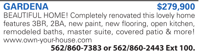 GARDENA $279,900 BEAUTIFUL HOME! Completely renovated this lovely home features 3BR, 2BA, new paint, new flooring, open kitchen, remodeled baths, master suite, covered patio & more!