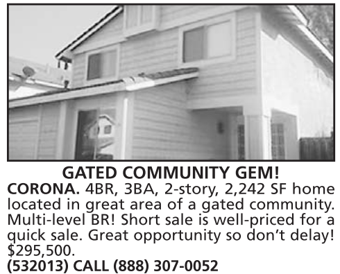 CORONA. 4BR, 3BA, 2-story, 2,242 SF home located in great area of a gated community. Multi-level BR! Short sale is well-priced for a quick sale. Great opportunity so don’t delay! $295,500. (532013) CALL (888) 307-0052