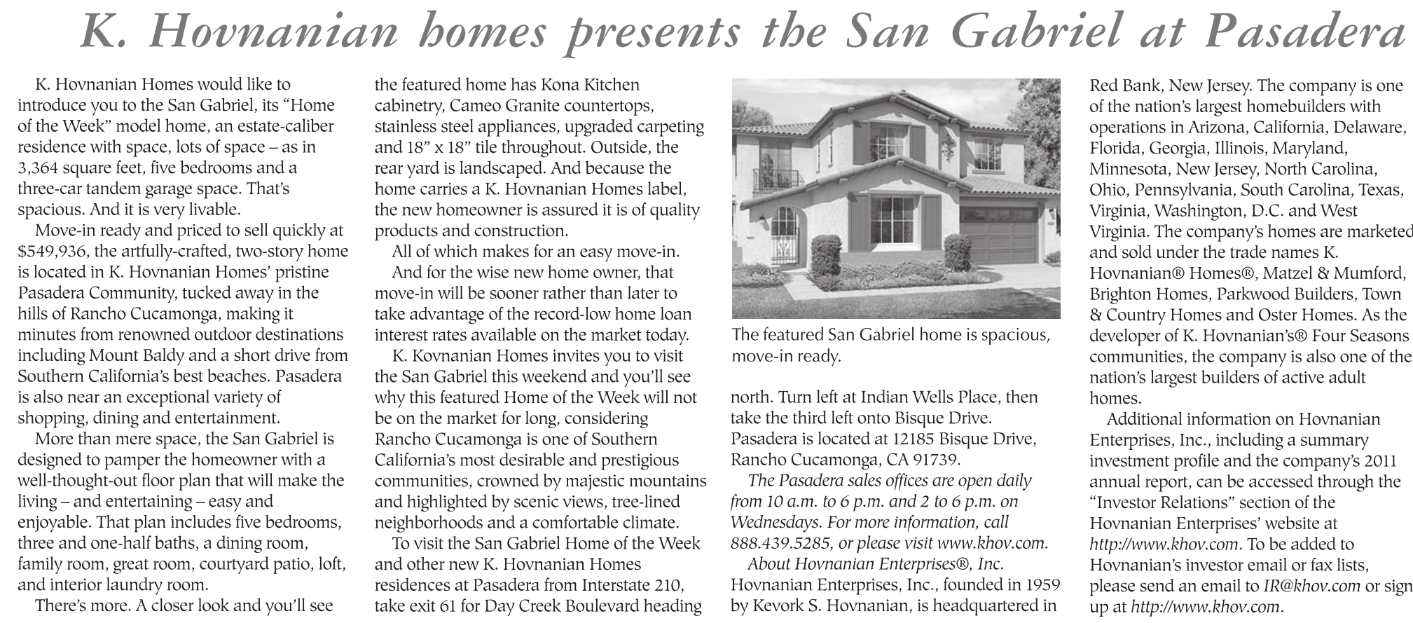 K. Hovnanian Homes would like to introduce you to the San Gabriel, its “Home of the Week” model home, an estate-caliber residence with space, lots of space – as in 3,364 square feet, five bedrooms and a three-car tandem garage space. That’s spacious. And it is very livable.