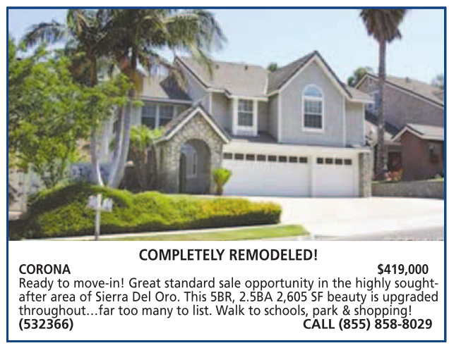 CORONA $419,000 Ready to move-in! Great standard sale opportunity in the highly soughtafter area of Sierra Del Oro. This 5BR, 2.5BA 2,605 SF beauty is upgraded throughout…far too many to list. Walk to schools, park & shopping! (532366) CALL (855) 858-8029