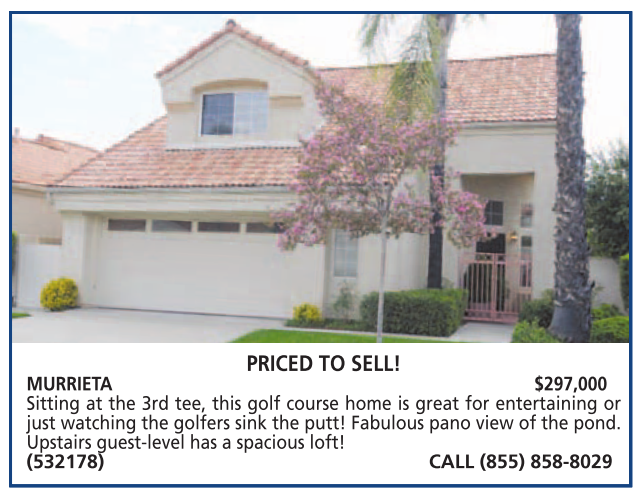 PRICED TO SELL! MURRIETA $297,000 Sitting at the 3rd tee, this golf course home is great for entertaining or just watching the golfers sink the putt! Fabulous pano view of the pond. Upstairs guest-level has a spacious loft! (532178) CALL (855) 858-8029
