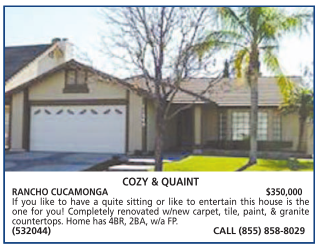 COZY & QUAINT RANCHO CUCAMONGA $350,000 If you like to have a quite sitting or like to entertain this house is the one for you! Completely renovated w/new carpet, tile, paint, & granite countertops. Home has 4BR, 2BA, w/a FP. (532044) CALL (855) 858-8029
