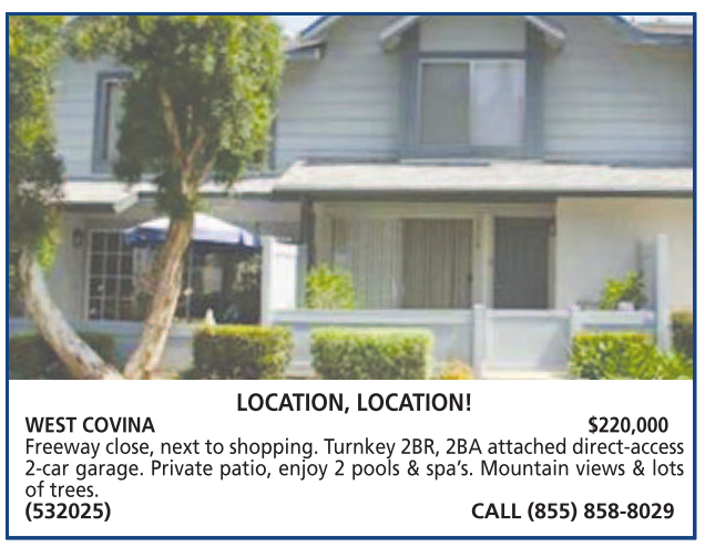 WEST COVINA $220,000 Freeway close, next to shopping. Turnkey 2BR, 2BA attached direct-access 2-car garage. Private patio, enjoy 2 pools & spa’s. Mountain views & lots of trees. (532025) CALL (855) 858-8029