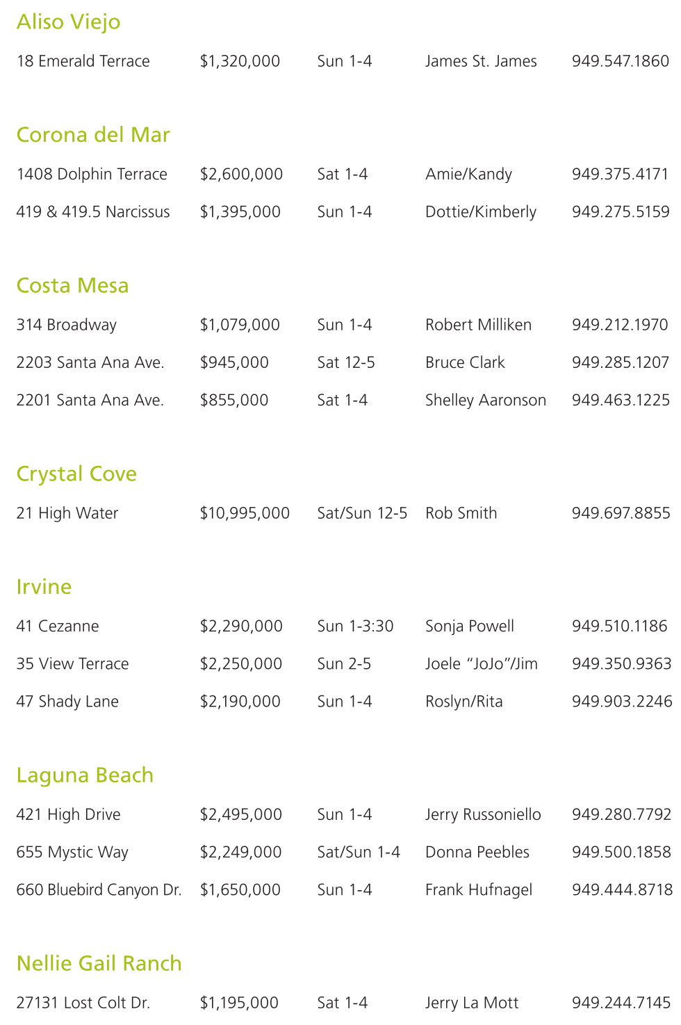 314 Broadway $1,079,000 Sun 1-4 Robert Milliken 949.212.1970 2203 Santa Ana Ave. $945,000 Sat 12-5 Bruce Clark 949.285.1207 2201 Santa Ana Ave. $855,000 Sat 1-4 Shelley Aaronson 949.463.1225
