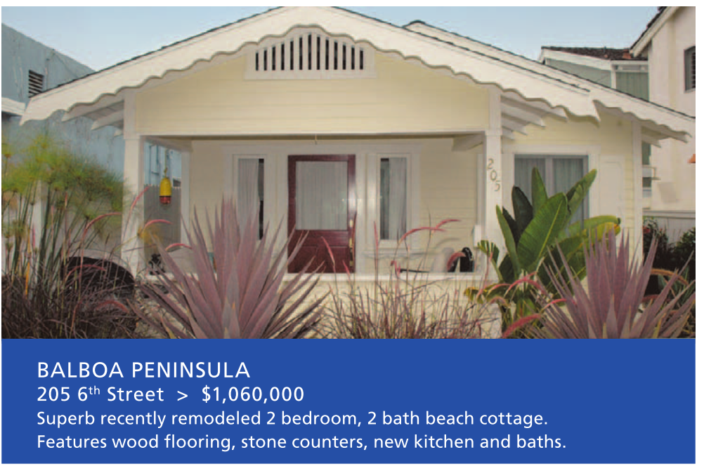 BALBOA PENINSULA 205 6 th Street > $1,060,000 Superb recently remodeled 2 bedroom, 2 bath beach cottage. Features wood flooring, stone counters, new kitchen and baths.
