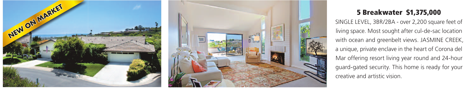 5 Breakwater $1,375,000 SINGLE LEVEL, 3BR/2BA - over 2,200 square feet of living space. Most sought after cul-de-sac location with ocean and greenbelt views. JASMINE CREEK, a unique, private enclave in the heart of Corona del Mar offering resort living year round and 24-hour guard-gated security. This home is ready for your creative and artistic vision.
