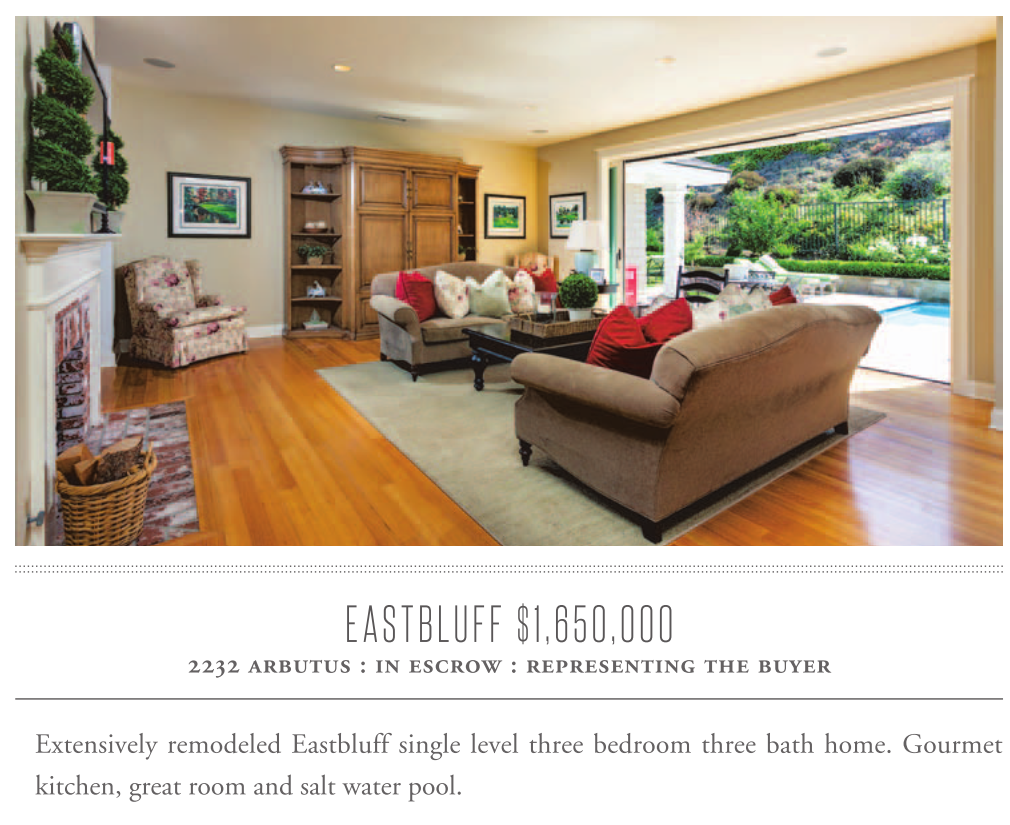 Extensively remodeled Eastbluff single level three bedroom three bath home. Gourmet kitchen, great room and salt water pool.