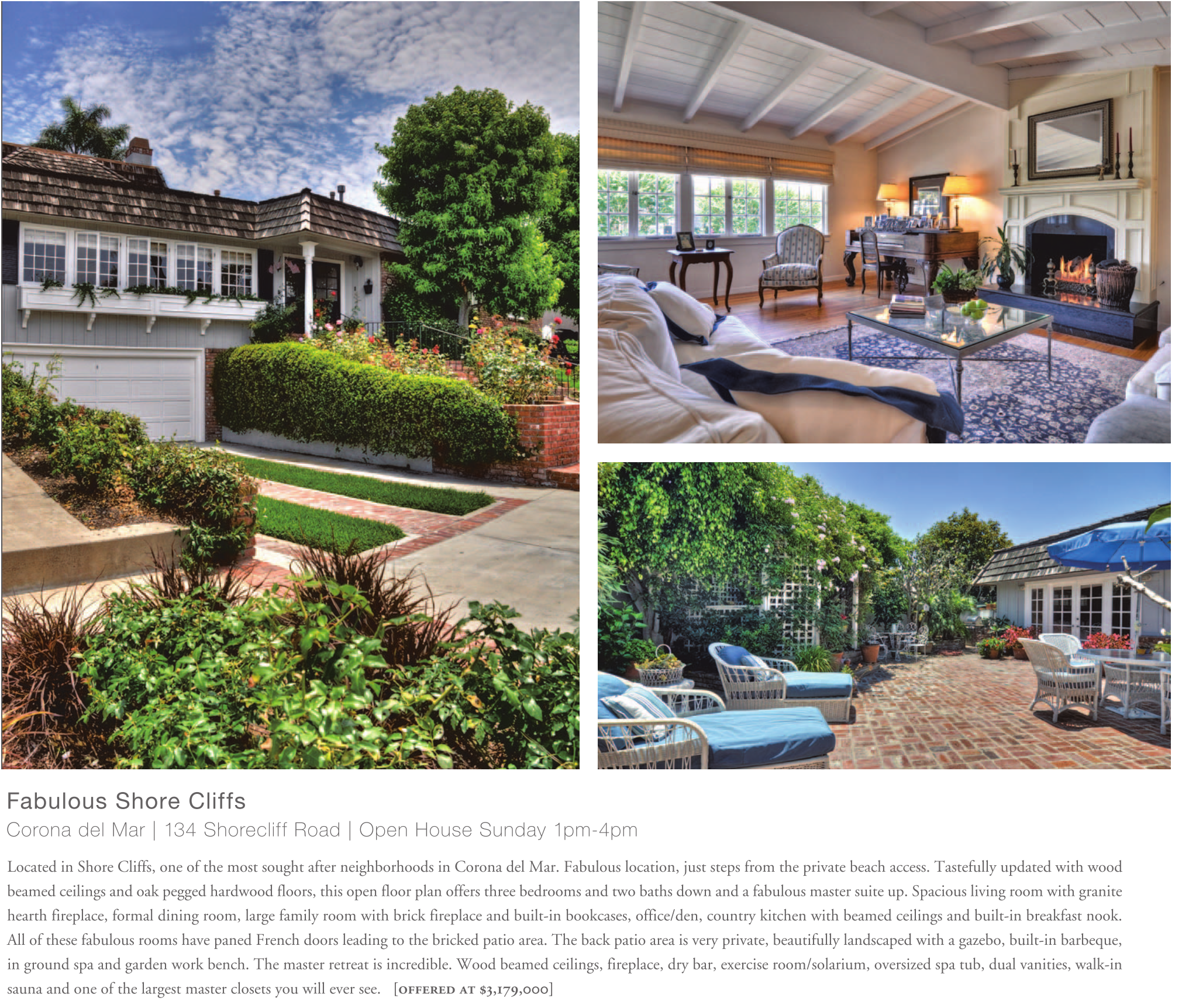 Fabulous Shore Cliffs Corona del Mar | 134 Shorecliff Road | Open House Sunday 1pm-4pm Located in Shore Cliffs, one of the most sought after neighborhoods in Corona del Mar. Fabulous location, just steps from the private beach access. Tastefully updated with wood beamed ceilings and oak pegged hardwood floors, this open floor plan offers three bedrooms and two baths down and a fabulous master suite up. Spacious living room with granite hearth fireplace, formal dining room, large family room with brick fireplace and built-in bookcases, office/den, country kitchen with beamed ceilings and built-in breakfast nook. All of these fabulous rooms have paned French doors leading to the bricked patio area. The back patio area is very private, beautifully landscaped with a gazebo, built-in barbeque, in ground spa and garden work bench. The master retreat is incredible. Wood beamed ceilings, fireplace, dry bar, exercise room/solarium, oversized spa tub, dual vanities, walk-in sauna and one of the largest master closets you will ever see. [offered at $3,179,000]