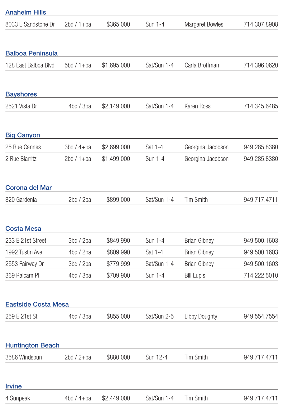 Anaheim Hills 8033 E Sandstone Dr 2bd / 1+ba $365,000 Sun 1-4 Margaret Bowles 714.307.8908 Balboa Peninsula 128 East Balboa Blvd 5bd / 1+ba $1,695,000 Sat/Sun 1-4 Carla Broffman 714.396.0620 Bayshores 2521 Vista Dr 4bd / 3ba $2,149,000 Sat/Sun 1-4 Karen Ross 714.345.6485 Big Canyon 25 Rue Cannes 3bd / 4+ba $2,699,000 Sat 1-4 Georgina Jacobson 949.285.8380 2 Rue Biarritz 2bd / 1+ba $1,499,000 Sun 1-4 Georgina Jacobson 949.285.8380 Corona del Mar 820 Gardenia 2bd / 2ba $899,000 Sat/Sun 1-4 Tim Smith 949.717.4711 Costa Mesa 233 E 21st Street 3bd / 2ba $849,990 Sun 1-4 Brian Gibney 949.500.1603 1992 Tustin Ave 4bd / 2ba $809,990 Sat 1-4 Brian Gibney 949.500.1603 2553 Fairway Dr 3bd / 2ba $779,999 Sat/Sun 1-4 Brian Gibney 949.500.1603 369 Ralcam Pl 4bd / 3ba $709,900 Sun 1-4 Bill Lupis 714.222.5010 Eastside Costa Mesa 259 E 21st St 4bd / 3ba $855,000 Sat/Sun 2-5 Libby Doughty 949.554.7554 Huntington Beach 3586 Windspun 2bd / 2+ba $880,000 Sun 12-4 Tim Smith 949.717.4711 Irvine 4 Sunpeak 4bd / 4+ba $2,449,000 Sat/Sun 1-4 Tim Smith 949.717.4711
