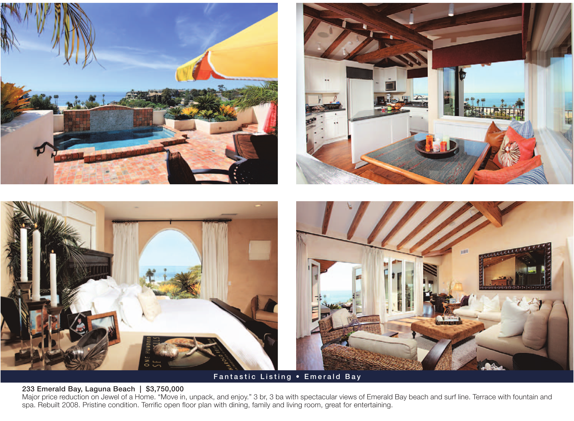 Fantastic Listing • Emerald Bay 233 Emerald Bay, Laguna Beach | $3,750,000 Major price reduction on Jewel of a Home. “Move in, unpack, and enjoy.” 3 br, 3 ba with spectacular views of Emerald Bay beach and surf line. Terrace with fountain and spa. Rebuilt 2008. Pristine condition. Terrific open floor plan with dining, family and living room, great for entertaining.
