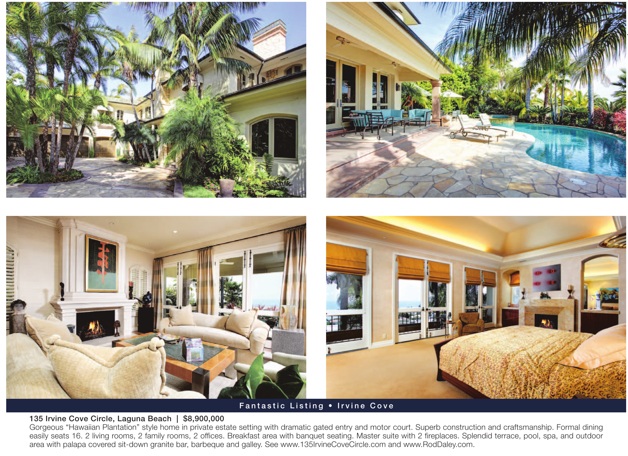 135 Irvine Cove Circle, Laguna Beach | $8,900,000 Gorgeous “Hawaiian Plantation” style home in private estate setting with dramatic gated entry and motor court. Superb construction and craftsmanship. Formal dining easily seats 16. 2 living rooms, 2 family rooms, 2 offices. Breakfast area with banquet seating. Master suite with 2 fireplaces. Splendid terrace, pool, spa, and outdoor area with palapa covered sit-down granite bar, barbeque and galley. See www.135IrvineCoveCircle.com and www.RodDaley.com.