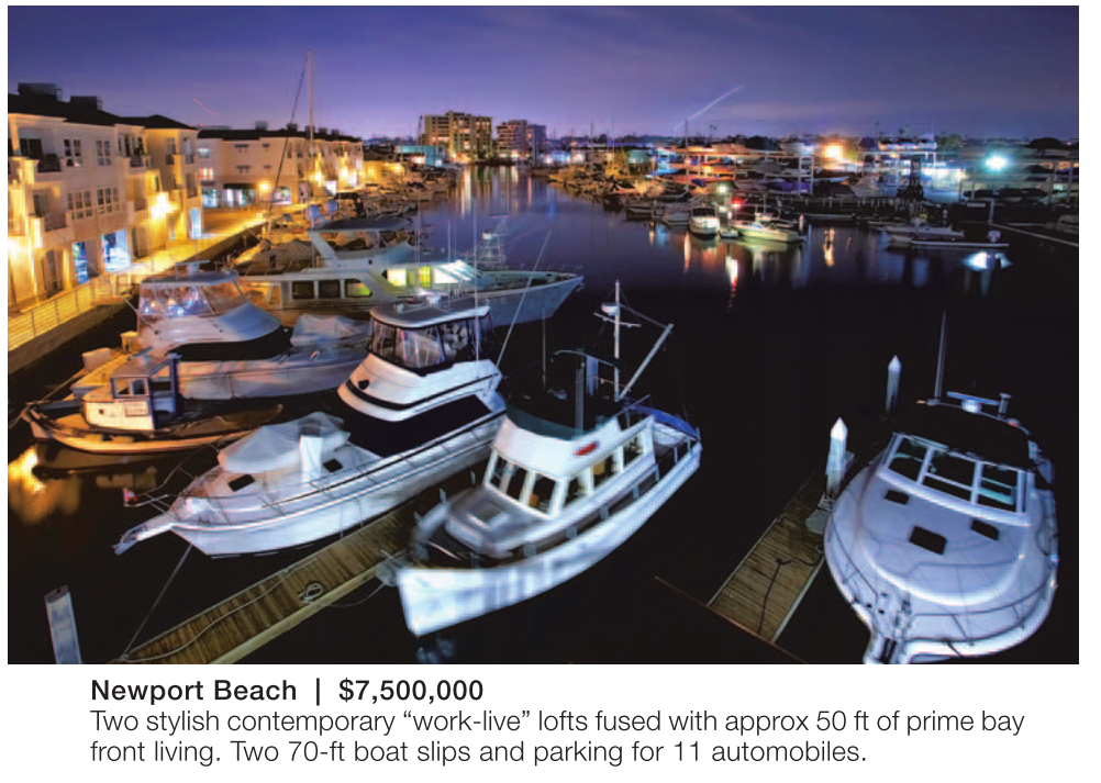 Newport Beach | $7,500,000 Two stylish contemporary “work-live” lofts fused with approx 50 ft of prime bay front living. Two 70-ft boat slips and parking for 11 automobiles.