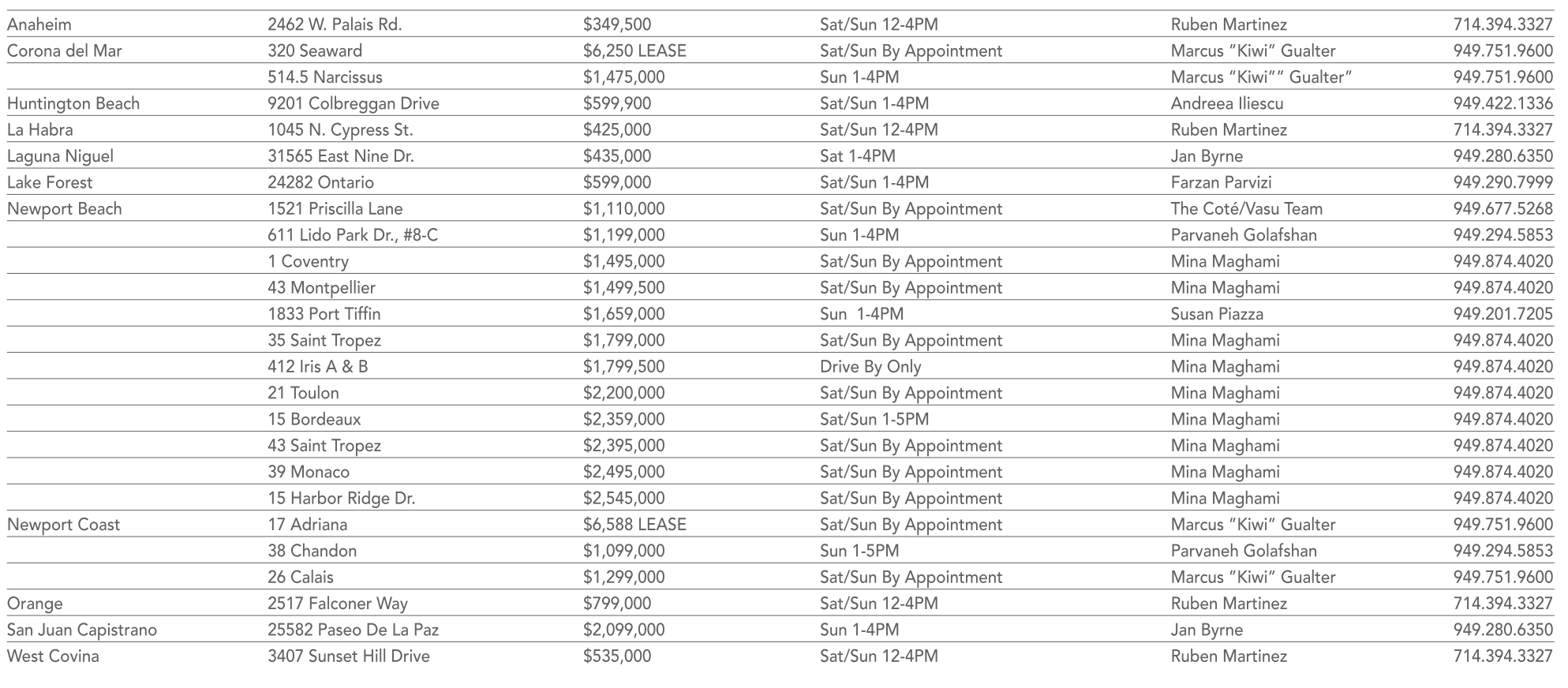 Anaheim 2462 W. Palais Rd. $349,500 Sat/Sun 12-4PM Ruben Martinez 714.394.3327 Corona del Mar 320 Seaward $6,250 LEASE Sat/Sun By Appointment Marcus ”Kiwi” Gualter 949.751.9600 514.5 Narcissus $1,475,000 Sun 1-4PM Marcus ”Kiwi”” Gualter” 949.751.9600 Huntington Beach 9201 Colbreggan Drive $599,900 Sat/Sun 1-4PM Andreea Iliescu 949.422.1336 La Habra 1045 N. Cypress St. $425,000 Sat/Sun 12-4PM Ruben Martinez 714.394.3327 Laguna Niguel 31565 East Nine Dr. $435,000 Sat 1-4PM Jan Byrne 949.280.6350 Lake Forest 24282 Ontario $599,000 Sat/Sun 1-4PM Farzan Parvizi 949.290.7999 Newport Beach 1521 Priscilla Lane $1,110,000 Sat/Sun By Appointment The Coté/Vasu Team 949.677.5268 611 Lido Park Dr., #8-C $1,199,000 Sun 1-4PM Parvaneh Golafshan 949.294.5853 1 Coventry $1,495,000 Sat/Sun By Appointment Mina Maghami 949.874.4020 43 Montpellier $1,499,500 Sat/Sun By Appointment Mina Maghami 949.874.4020 1833 Port Tiffin $1,659,000 Sun 1-4PM Susan Piazza 949.201.7205 35 Saint Tropez $1,799,000 Sat/Sun By Appointment Mina Maghami 949.874.4020 412 Iris A & B $1,799,500 Drive By Only Mina Maghami 949.874.4020 21 Toulon $2,200,000 Sat/Sun By Appointment Mina Maghami 949.874.4020 15 Bordeaux $2,359,000 Sat/Sun 1-5PM Mina Maghami 949.874.4020 43 Saint Tropez $2,395,000 Sat/Sun By Appointment Mina Maghami 949.874.4020 39 Monaco $2,495,000 Sat/Sun By Appointment Mina Maghami 949.874.4020 15 Harbor Ridge Dr. $2,545,000 Sat/Sun By Appointment Mina Maghami 949.874.4020 Newport Coast 17 Adriana $6,588 LEASE Sat/Sun By Appointment Marcus ”Kiwi” Gualter 949.751.9600 38 Chandon $1,099,000 Sun 1-5PM Parvaneh Golafshan 949.294.5853 26 Calais $1,299,000 Sat/Sun By Appointment Marcus ”Kiwi” Gualter 949.751.9600 Orange 2517 Falconer Way $799,000 Sat/Sun 12-4PM Ruben Martinez 714.394.3327 San Juan Capistrano 25582 Paseo De La Paz $2,099,000 Sun 1-4PM Jan Byrne 949.280.6350 West Covina 3407 Sunset Hill Drive $535,000 Sat/Sun 12-4PM Ruben Martinez 714.394.3327