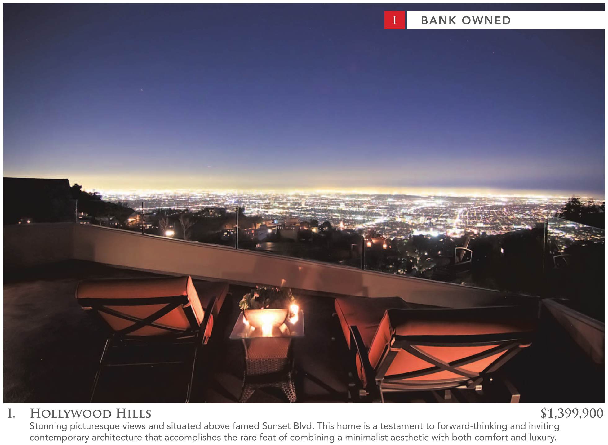 I BANK OWNED I. Hollywood Hills $1,399,900 Stunning picturesque views and situated above famed Sunset Blvd. This home is a testament to forward-thinking and inviting contemporary architecture that accomplishes the rare feat of combining a minimalist aesthetic with both comfort and luxury.