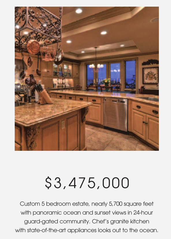 Custom 5 bedroom estate, nearly 5,700 square feet with panoramic ocean and sunset views in 24-hour guard-gated community. Chef’s granite kitchen with state-of-the-art appliances looks out to the ocean.