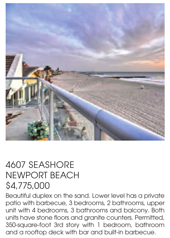 4607 SEASHORE NEWPORT BEACH $4,775,000 Beautiful duplex on the sand. Lower level has a private patio with barbecue, 3 bedrooms, 2 bathrooms, upper unit with 4 bedrooms, 3 bathrooms and balcony. Both units have stone floors and granite counters. Permitted, 350-square-foot 3rd story with 1 bedroom, bathroom and a rooftop deck with bar and built-in barbecue.