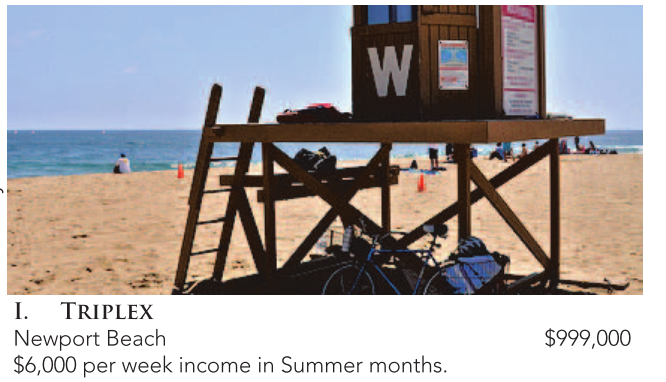 Newport Beach $999,000 $6,000 per week income in Summer months.
