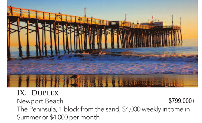 IX. Duplex Newport Beach $899,000 $799,000 The Peninsula, 1 block from the sand, $4,000 weekly income in Summer or $4,000 per month
