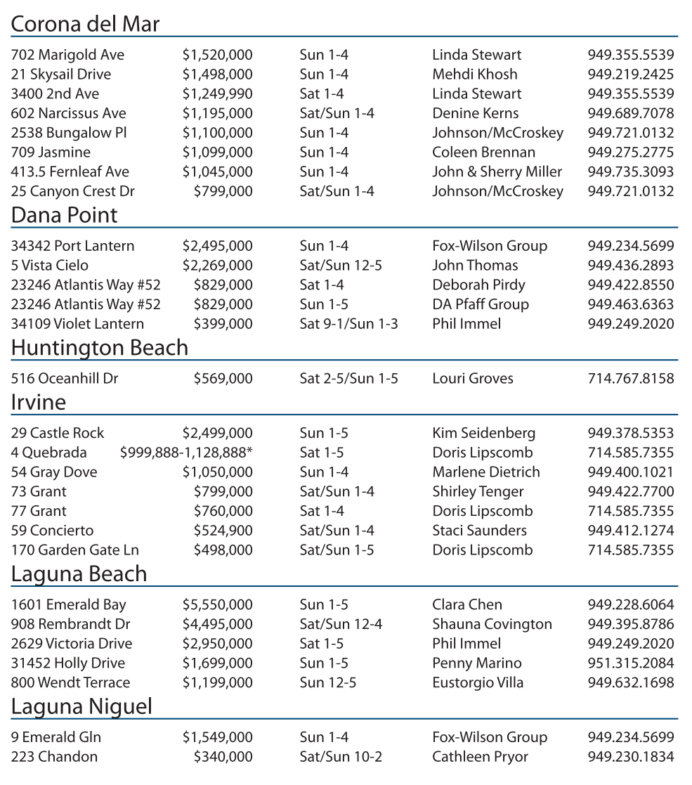 702 Marigold Ave $1,520,000 Sun 1-4 Linda Stewart 949.355.5539 21 Skysail Drive $1,498,000 Sun 1-4 Mehdi Khosh 949.219.2425 3400 2nd Ave $1,249,990 Sat 1-4 Linda Stewart 949.355.5539 602 Narcissus Ave $1,195,000 Sat/Sun 1-4 Denine Kerns 949.689.7078 2538 Bungalow Pl $1,100,000 Sun 1-4 Johnson/McCroskey 949.721.0132 709 Jasmine $1,099,000 Sun 1-4 Coleen Brennan 949.275.2775 413.5 Fernleaf Ave $1,045,000 Sun 1-4 John & Sherry Miller 949.735.3093 25 Canyon Crest Dr $799,000 Sat/Sun 1-4 Johnson/McCroskey 949.721.0132 Dana Point 34342 Port Lantern $2,495,000 Sun 1-4 Fox-Wilson Group 949.234.5699 5 Vista Cielo $2,269,000 Sat/Sun 12-5 John Thomas 949.436.2893 23246 Atlantis Way #52 $829,000 Sat 1-4 Deborah Pirdy 949.422.8550 23246 Atlantis Way #52 $829,000 Sun 1-5 DA Pfaff Group 949.463.6363 34109 Violet Lantern $399,000 Sat 9-1/Sun 1-3 Phil Immel 949.249.2020 Huntington Beach 516 Oceanhill Dr $569,000 Sat 2-5/Sun 1-5 Louri Groves 714.767.8158 Irvine 29 Castle Rock $2,499,000 Sun 1-5 Kim Seidenberg 949.378.5353 4 Quebrada $999,888-1,128,888* Sat 1-5 Doris Lipscomb 714.585.7355 54 Gray Dove $1,050,000 Sun 1-4 Marlene Dietrich 949.400.1021 73 Grant $799,000 Sat/Sun 1-4 Shirley Tenger 949.422.7700 77 Grant $760,000 Sat 1-4 Doris Lipscomb 714.585.7355 59 Concierto $524,900 Sat/Sun 1-4 Staci Saunders 949.412.1274 170 Garden Gate Ln $498,000 Sat/Sun 1-5 Doris Lipscomb 714.585.7355 Laguna Beach 1601 Emerald Bay $5,550,000 Sun 1-5 Clara Chen 949.228.6064 908 Rembrandt Dr $4,495,000 Sat/Sun 12-4 Shauna Covington 949.395.8786 2629 Victoria Drive $2,950,000 Sat 1-5 Phil Immel 949.249.2020 31452 Holly Drive $1,699,000 Sun 1-5 Penny Marino 951.315.2084 800 Wendt Terrace $1,199,000 Sun 12-5 Eustorgio Villa 949.632.1698 Laguna Niguel 9 Emerald Gln $1,549,000 Sun 1-4 Fox-Wilson Group 949.234.5699 223 Chandon $340,000 Sat/Sun 10-2 Cathleen Pryor 949.230.1834