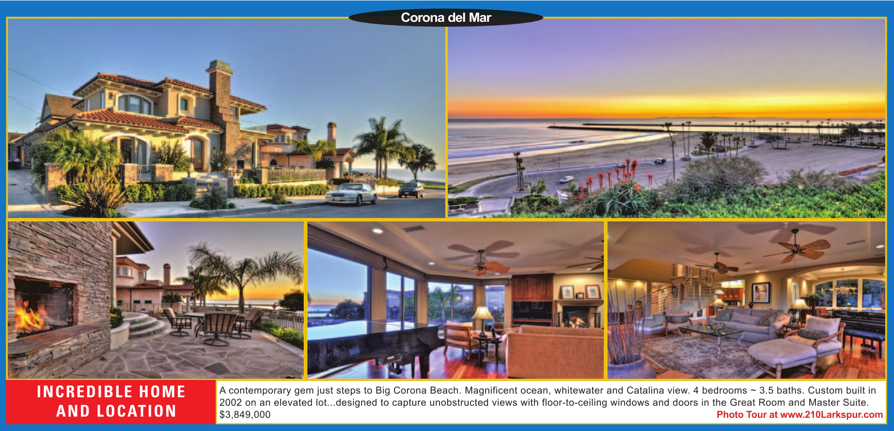 A contemporary gem just steps to Big Corona Beach. Magnificent ocean, whitewater and Catalina view. 4 bedrooms ~ 3.5 baths. Custom built in 2002 on an elevated lot...designed to capture unobstructed views with floor-to-ceiling windows and doors in the Great Room and Master Suite. $3,849,000 Photo Tour at www.210Larkspur.com